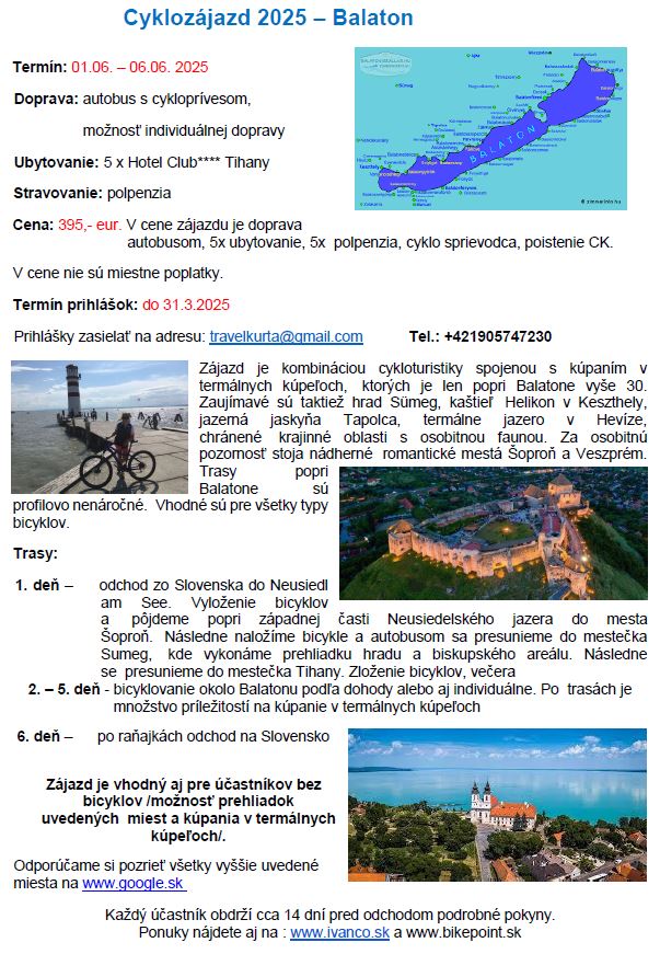 IPA územná úradovňa Trnava pozýva svojich členov na cyklo zájazd. Nemusí to byť vyslovene iba cyklo, ale aj turistika, prípadne aj poznávačka miestnych pamiatok a špecialít. Autobus máme k dispozícii celú dobu, takže za nejaký poplatok vieme dohodnúť aj výlety po okolí.